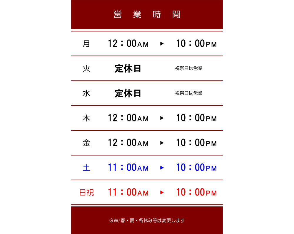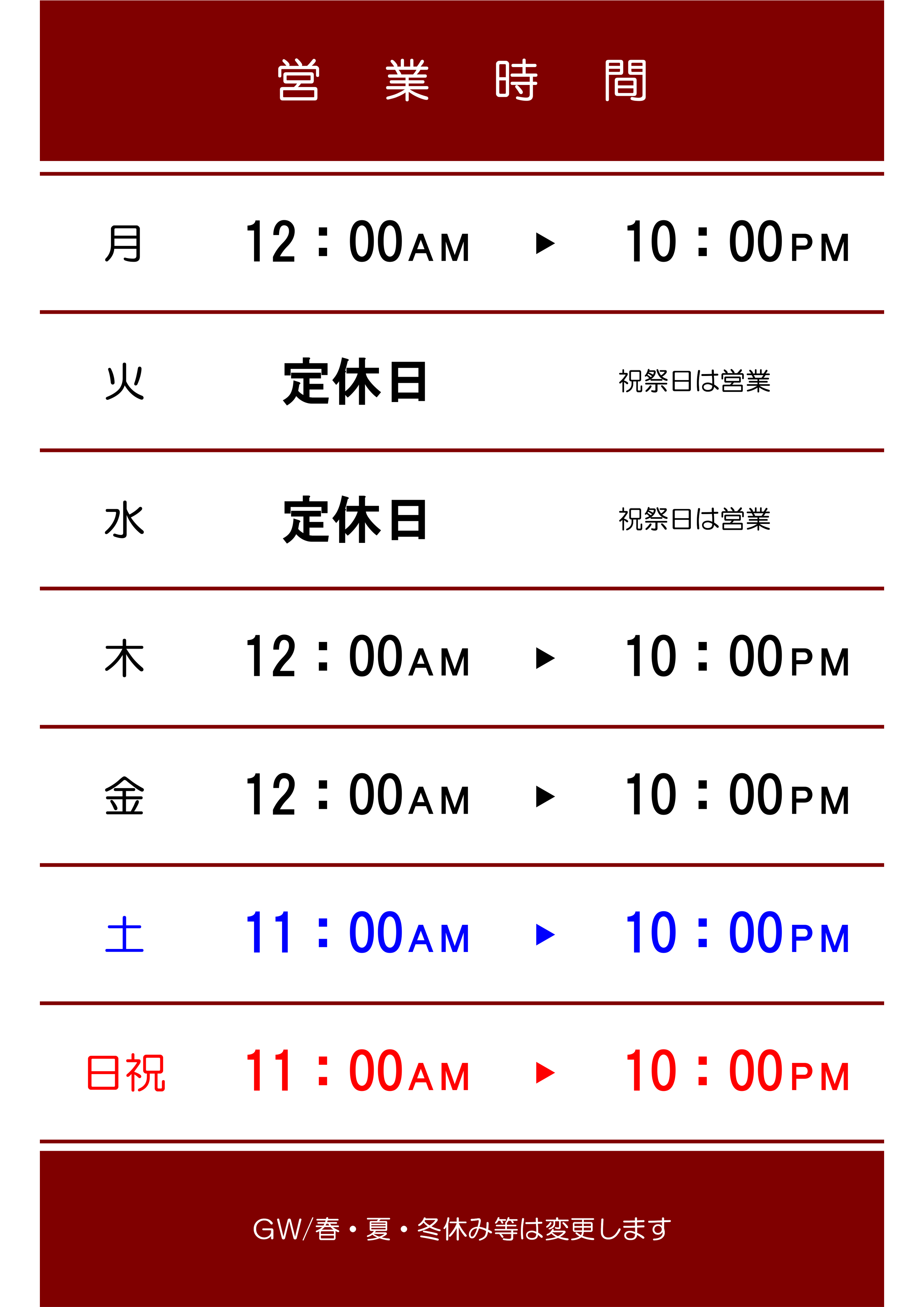 - 2024年1月22日(月)から平日の営業開始が12時からに変更になります